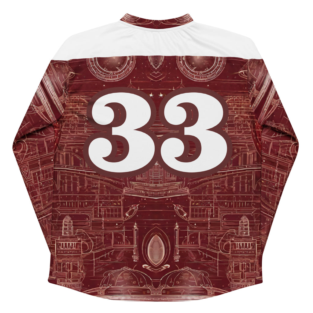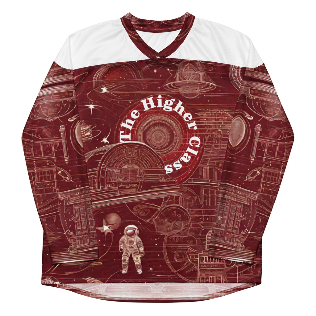 "The Higher Class" 33 team jersey, featuring a space and astronaut theme, showcases elevated vibes in burgundy and white colors. The design includes the number 33, symbolizing personal growth and the support of a spiritual cheer squad. This jersey embodies sophistication, cosmic wonder, and a reminder that success is a collective journey.